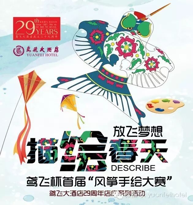 即日起至3月30日,在酒店用餐即可为家中的小朋友领取空白风筝一套,(也可带小朋友现场绘制),同时填写报名信息。数量有限发完为止!在规定的期限内,将绘制好的风筝与作者的合照,上传至酒店微信平台进行网上投票评选,根据投票评选情况发放纪念品和奖品,并颁发获奖证书。