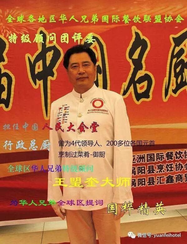 王圣奎大师简介 中国烹饪大师 ; 国家一级评委; 国际烹饪大师; 国际餐饮业专家评委; 中国国宴创始人 ; 原人民大会堂行政总厨; 中国国际饭店烹饪协会荣誉会长; 重庆商务学院终身荣誉院长; 中国民营企业国际合作发展促进国际酒店行业委员会副会长; 首诚农业有限公司总经理; 中国民营企业国际合作发展促进会餐饮文化委员会常务会长 。 圣怡堂有限公司董事; 国务院各部委厨师在岗职业晋级培训理论讲师、实操讲师; 1971年10月起至今在北京人民大会堂工作; 1988年参加日本扎幌世界烹饪大赛获2枚金牌; 1993年参加全国第三届烹饪技术大赛获2枚金牌,并获全国优秀厨师称号; 1994年获得“全国优秀厨师称号”; 1998年入选《中国名人大词典》; 2002年11月被中国商业联合会、烹饪协会授予“中国烹饪名师”; 2004年经中央国家机关委员评审授予中央国家机关中国烹饪大师称号; 2012年3月被选入《国家名厨》; 此外王大师合作撰写并出版了专业烹饪类书籍:《国宴菜谱集锦》、《人民大会堂国宴菜点精选》、《国宴食品雕刻》,并发表了论文《南北食品雕刻及特点》等; 部分国宴菜品赏析 国宴罐焖牛肉 国宴熏鱼 鸡茸菜心 山珍葫芦鸡 袖珍金钱菇 兰花春笋 国宴竹笙上汤 玛瑙菌香大连鲍 养生菜卷